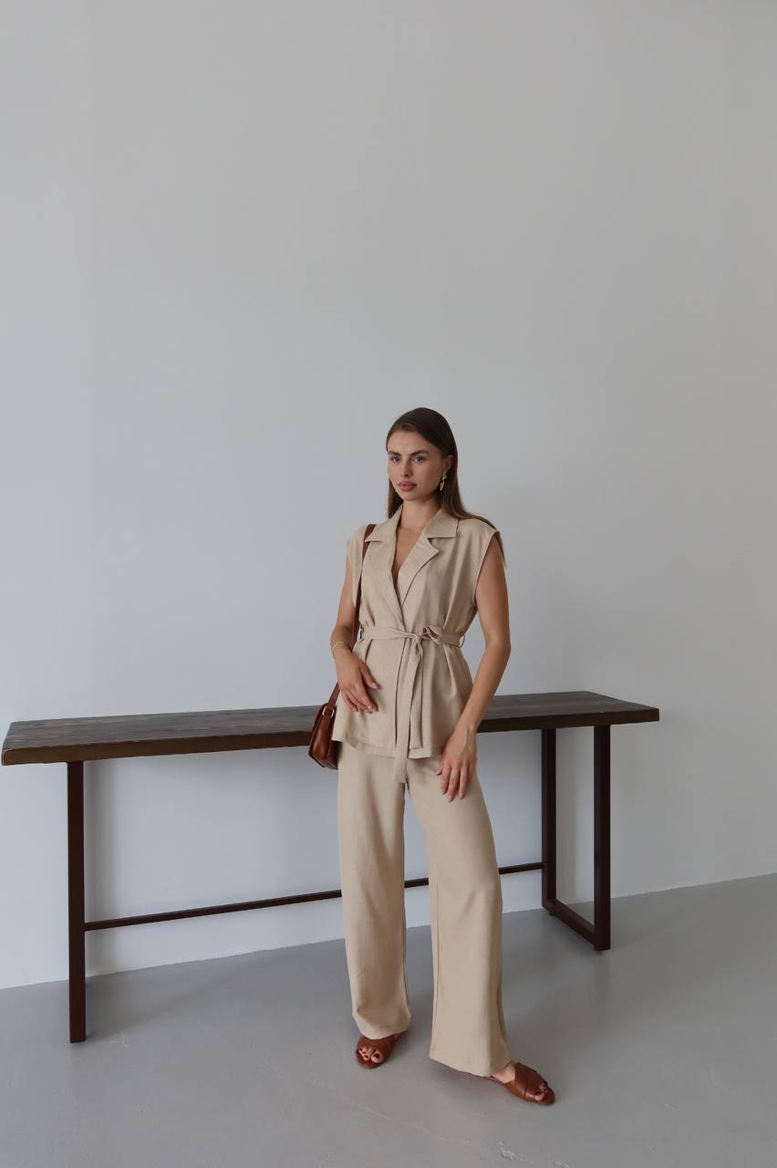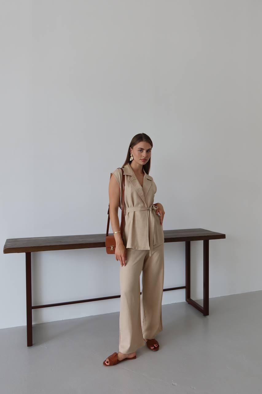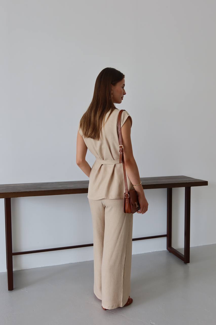 Keten Kuşaklı Blazer Yelek ve Yüksek Bel Bol Paça Pantolon Takım