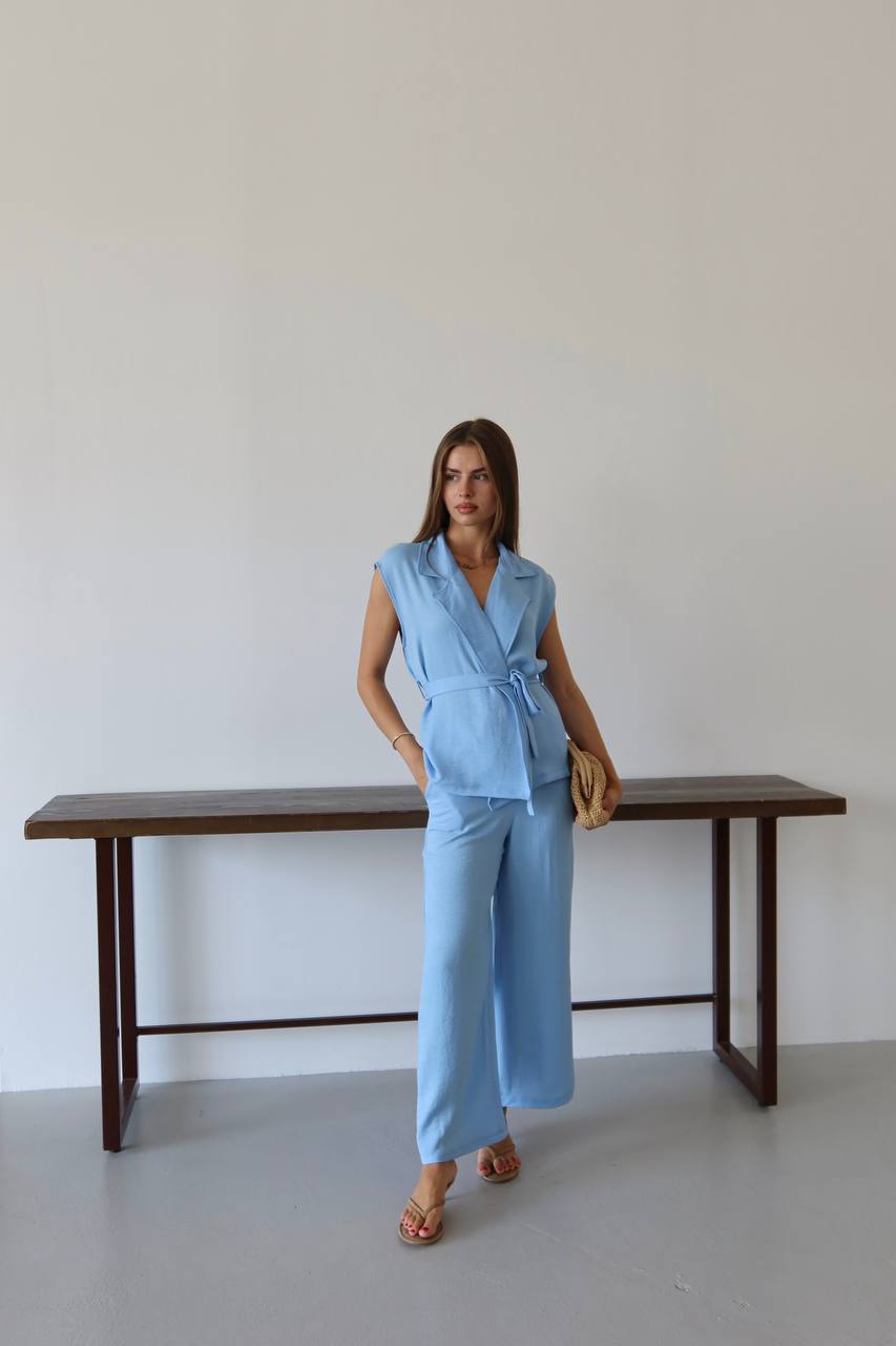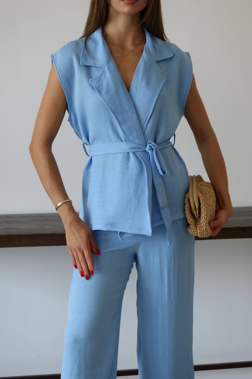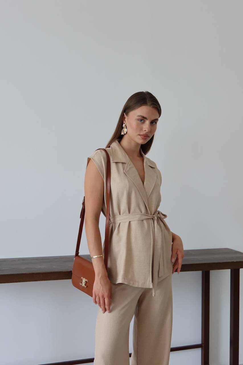 Keten Kuşaklı Blazer Yelek ve Yüksek Bel Bol Paça Pantolon Takım